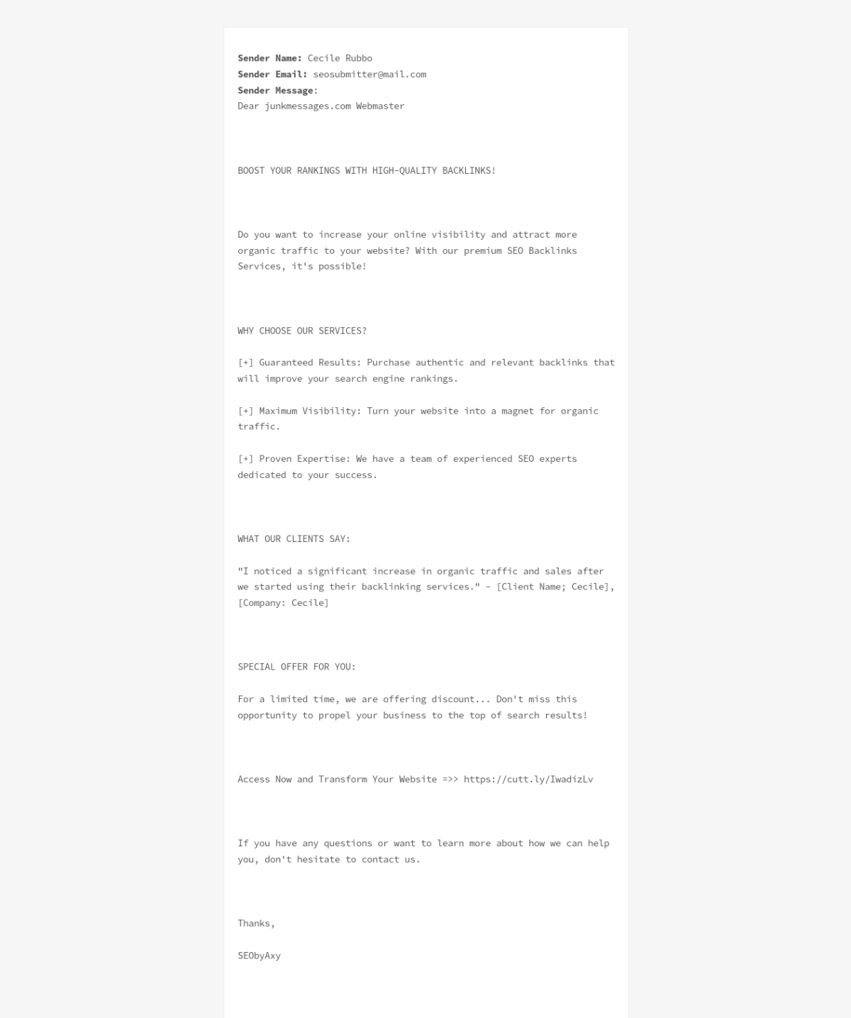 Upon analyzing the originating domain of the email ([email protected]), it does not exhibit solid signs of legitimacy; this already raises suspicion. Further, the use of a shortened URL (cutt.ly) obscures the destination, which is a common tactic in phishing attempts to prevent the recipient from seeing the actual URL and assessing its safety. The sender utilizes persuasive language to encourage immediate action, which is typical of phishing strategies.